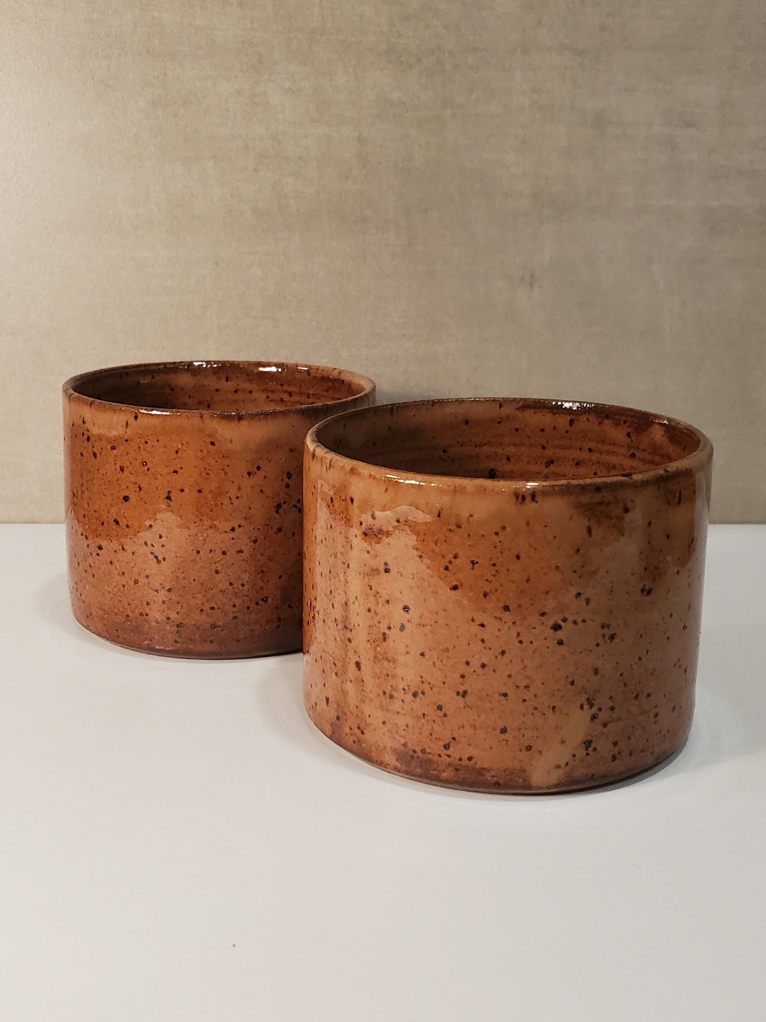 With a satin, toasty finish - it's a creamy brown with a lean toward rust and pink tones, and varies based on the thickness of application. Used over an iron rich clay that fires almost black, this collection is a personal favorite. It's a little moody, modern, and has a depth of color that is hard to capture in a photograph.