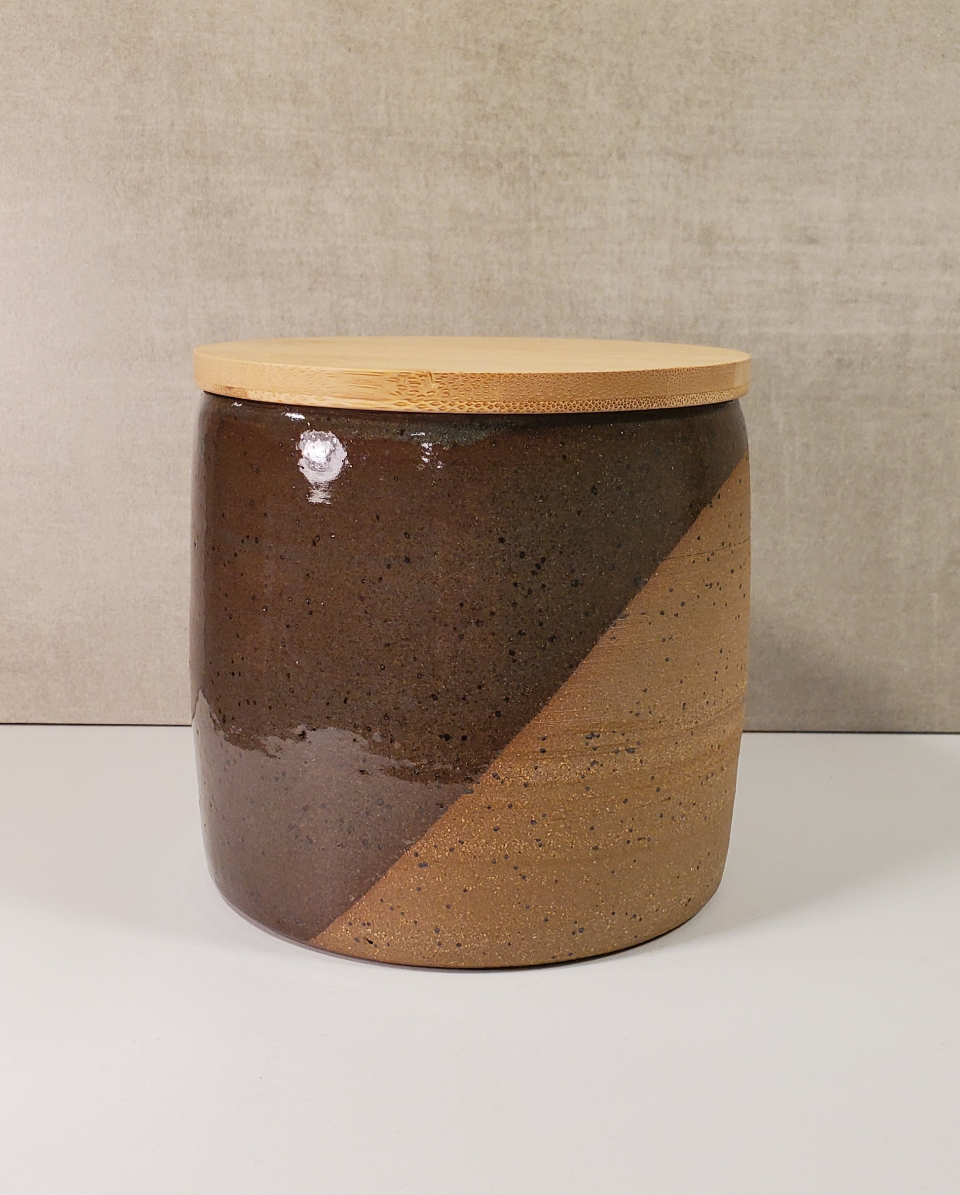 My ceramic, wheel-thrown lidded canisters are made of stoneware clay, and finished with a variety of hand-mixed glaze options. Wooden lids have a silicone gasket for an air-tight closure. These handmade, ceramic canisters are decorative and perfect for counter top storage. They make a perfect coffee canister, sugar canister, garlic canister, tea canister and would work well for candy, dog treats, etc.